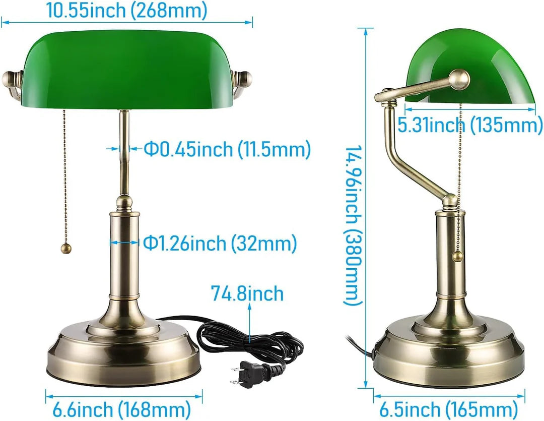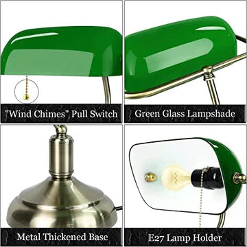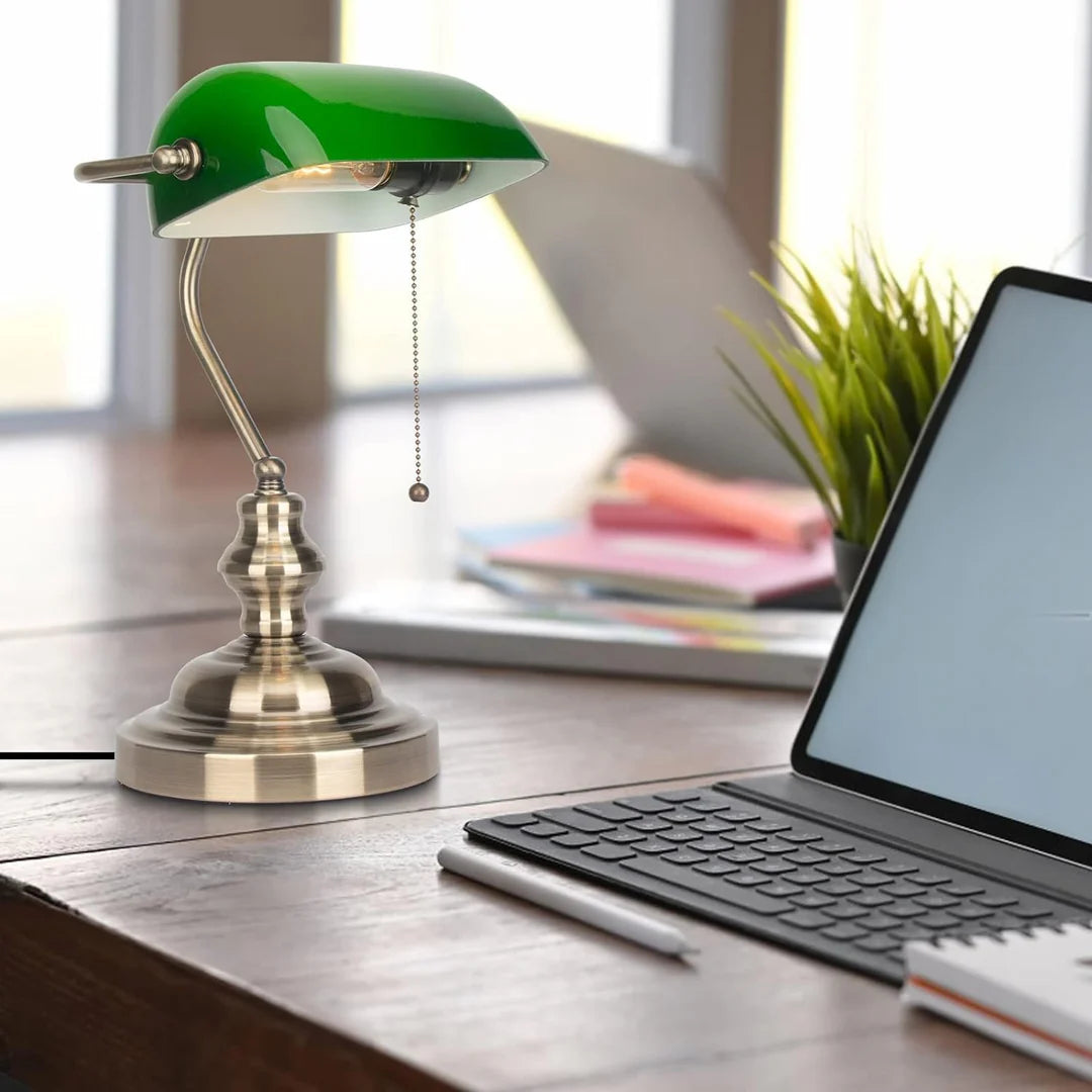 Luxiono Lighting Traditional Banker Lamp,Antique Desk Lamps with Brass Finish Base, raditional Library Lamp with Pull Chain, E26 Base, Vintage Desk Lamp for Office, Study Room,with Bulb (Metal, Green Shade)
