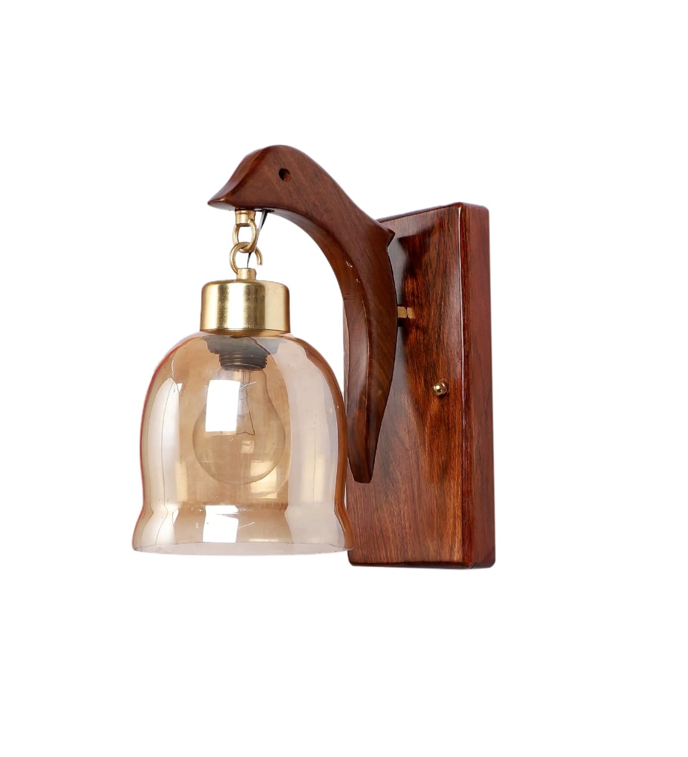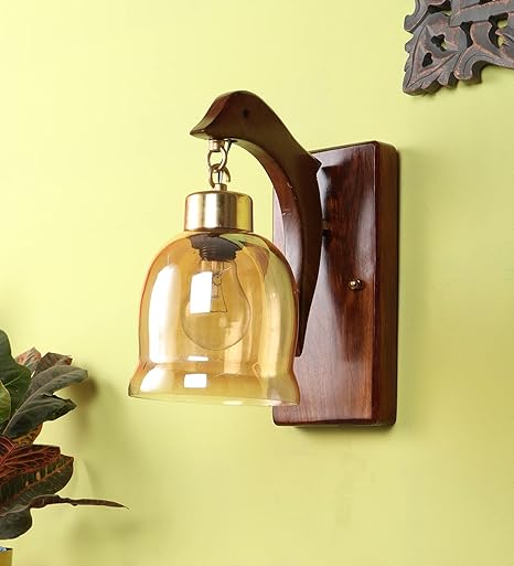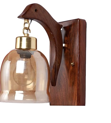 Luxiono Lighting Wood Wall Lamp with Unique Fish Design/Gold Plated Metal Cap, Brass Hook along with Luster Bell Glass with E27 Bulb Holder(Bulb not Included) for Bedroom, Living Room, Hallway or any Space of Your Choice
